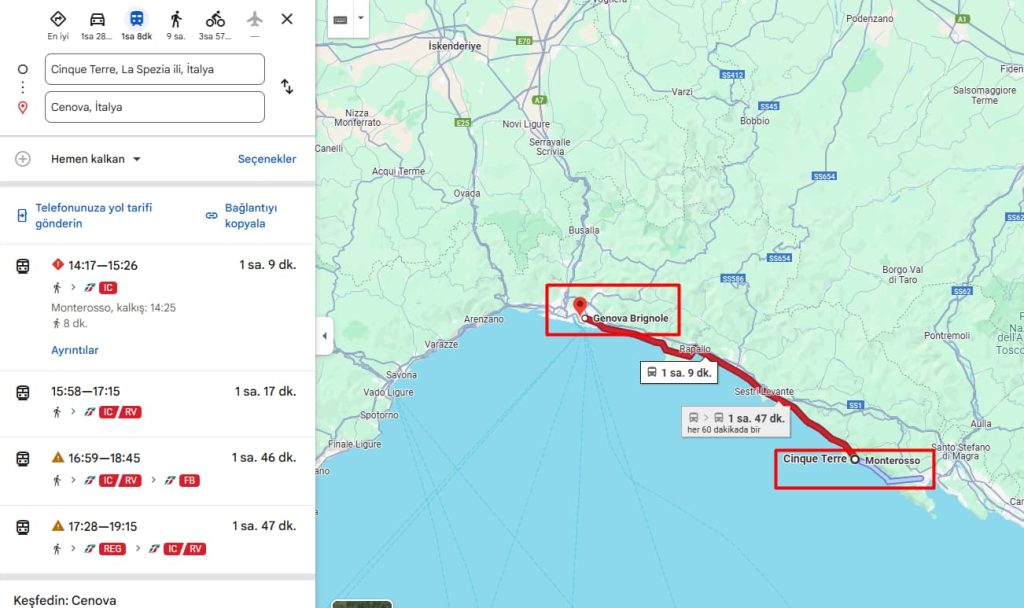 | Genova – Monterosso | 2 saat | €25 | 2 |