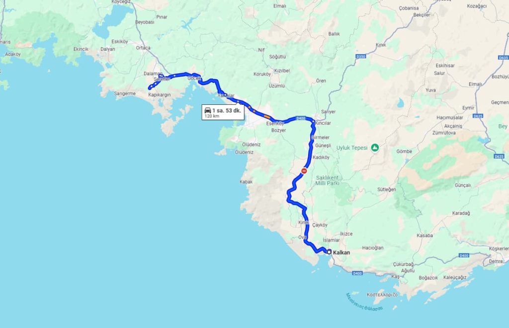 | Dalaman Havalimanı → Köyceğiz → Fethiye → Kalkan | ~150 km | 2 saat 15 dakika |