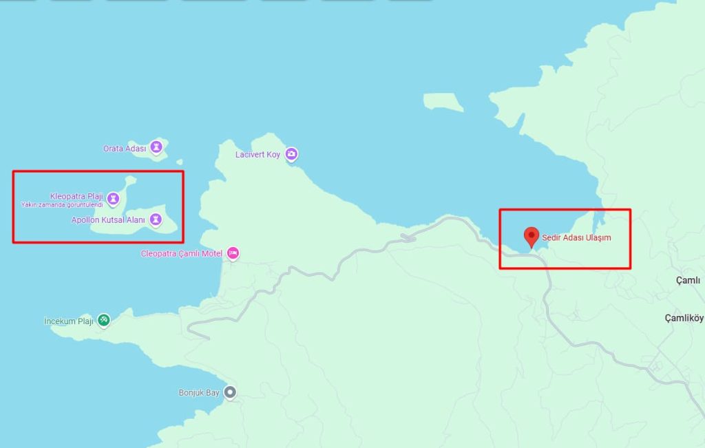 - Çamlıköy → Sedir Adası: 20 dakikalık tekne yolculuğu