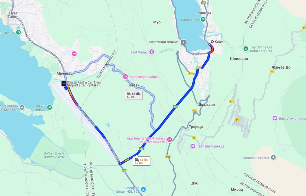 🧭 Harita Üzerinde Kotor Havalimanı – Şehir Merkezi Rotaları