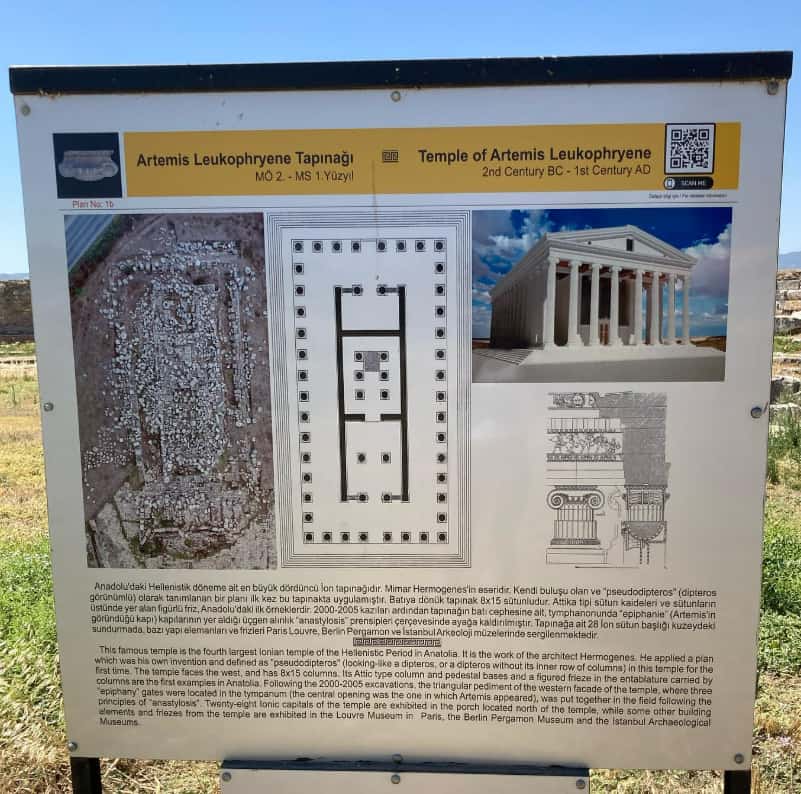 Antik dönemde Ay Tanrıçası Artemis’e adanmış bu tapınak, Efes Artemis Tapınağı’ndan sonra en büyük ikinci tapınaktır. Helenistik mimarinin izlerini taşıyan tapınak, sütunları ve kabartmalarıyla büyüleyicidir.