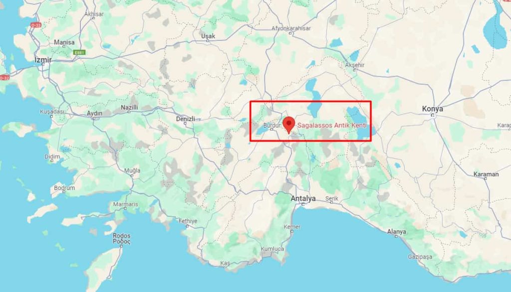 Sagalassos Antik Kenti, Türkiye’nin güneybatısında, Antalya iline bağlı Burdur ilinin Ağlasun ilçesi sınırları içinde bulunmaktadır. Antalya’ya yaklaşık olarak 110 kilometre uzaklıkta olan Sagalassos, Likya ve Pisidya bölgeleri arasında stratejik bir konuma sahiptir. Bu antik kent, Anadolu’nun iç kesimlerinde yer alır ve zengin tarihi ve arkeolojik mirasıyla bilinir. Sagalassos’un konumu, tarih boyunca önemli bir yerleşim yeri olmasını sağlamıştır.