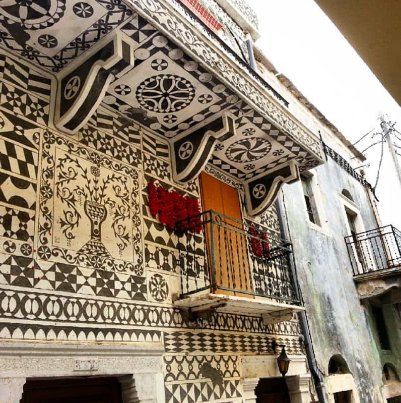 Sakız Adası’nın en büyük köylerinden biridir ve ünlü desenli duvarlarıyla tanınır. Köydeki evlerin çoğu beyaz renkte olup siyah geometrik desenlerle süslenmiştir.