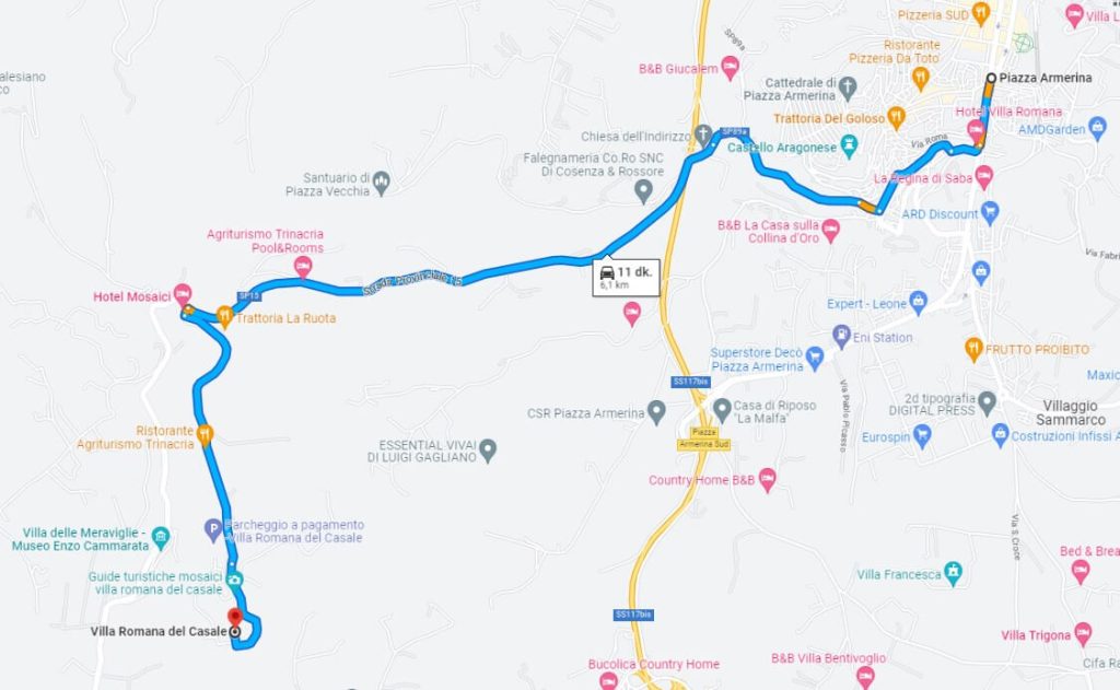 - Toplu taşıma: Piazza Armerina’ya, Katanya (Catania), Palermo, Messina ve Siracusa gibi diğer şehirlerden tren ve otobüslerle ulaşım mümkündür. Piazza Armerina’da şehir merkezindeki otobüs terminalinden veya tren istasyonundan kalkan minibüslerle villa’ya ulaşmak mümkündür.